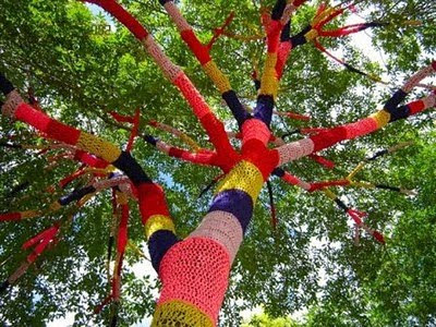 New movement sweeping the London streets .. its illegal .. but really its the most unoffensive form of graffiti out there. Who could possibly come across a tree wrapped in neon colored yarn and not smile .. just a little at least :)